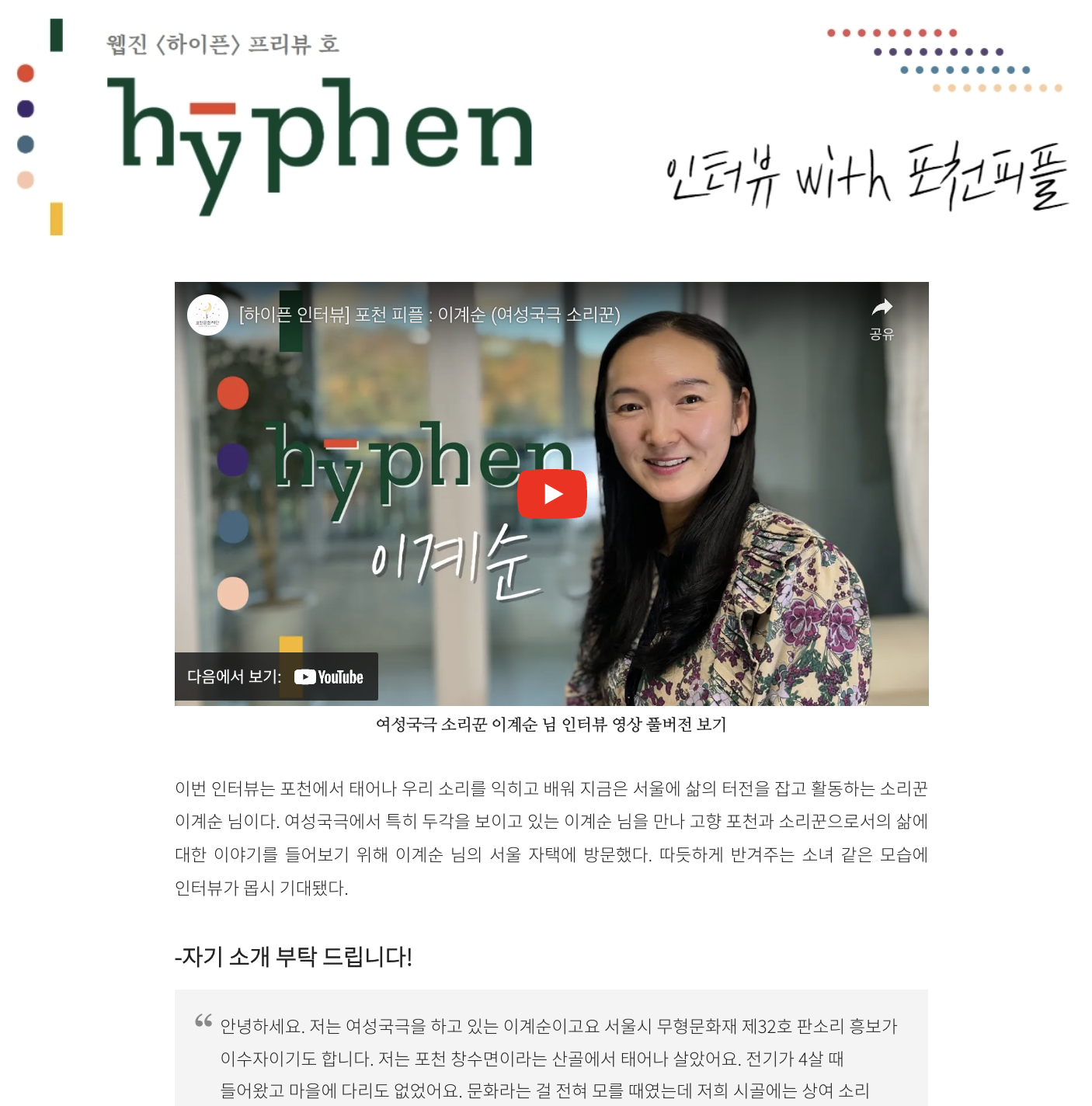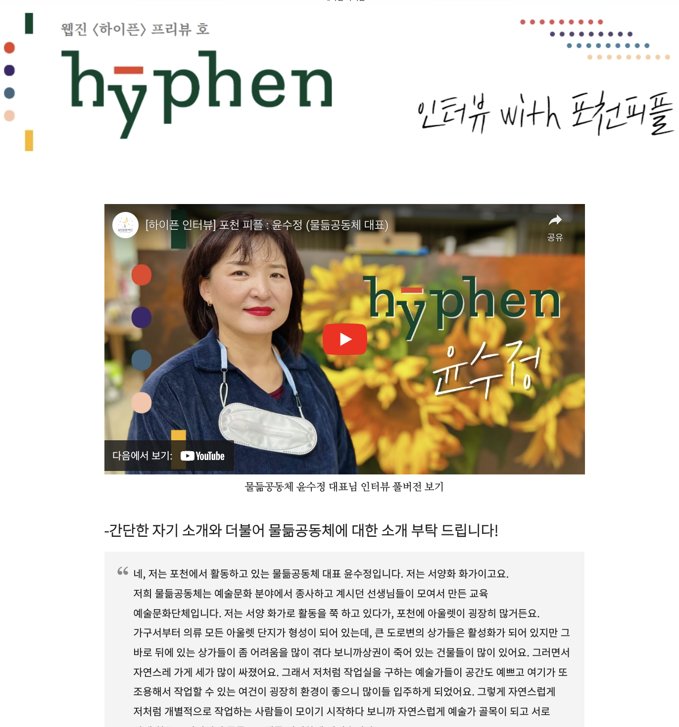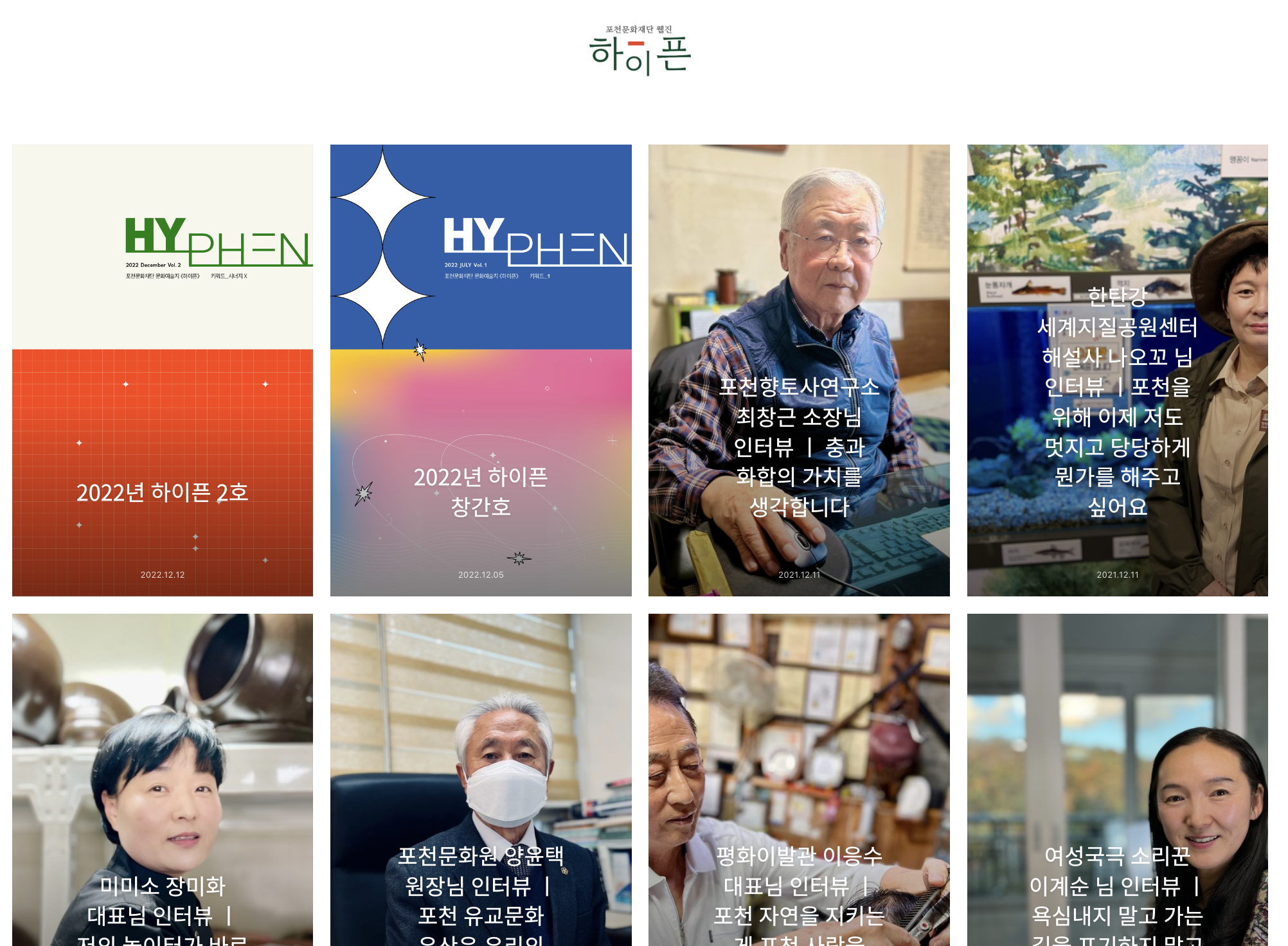 -포천문화재단 발행 온오프라인매거진 <하이픈> 프리뷰호 전담 진행 -웹진 온라인 플랫폼 개설 및 웹진 포스팅 콘텐츠 16개 제작 -인터뷰 영상 15개 제작 -오프라인용 웹진 기획 및 원고 작성, 편집디자인 등 제작 운영 총괄 포천문화재단 웹진 <하이픈> 바로가기 (클릭) 매거진 하이픈 포천문화재단이 운영하는 온오프라인 매거진 <하이픈>입니다. 오프라인 매거진은 상 하반기 발행됩니다. hyphen-pocheon.tistory.com 인터뷰 영상#1 인터뷰 영상#2 인터뷰 영상#3 웹진 <하이픈> 메인 페이지 포스팅 콘텐츠#1 포스팅 콘텐츠#2 포스팅 콘텐츠#3 공유하기 게시글 관리 주식회사 퓌트