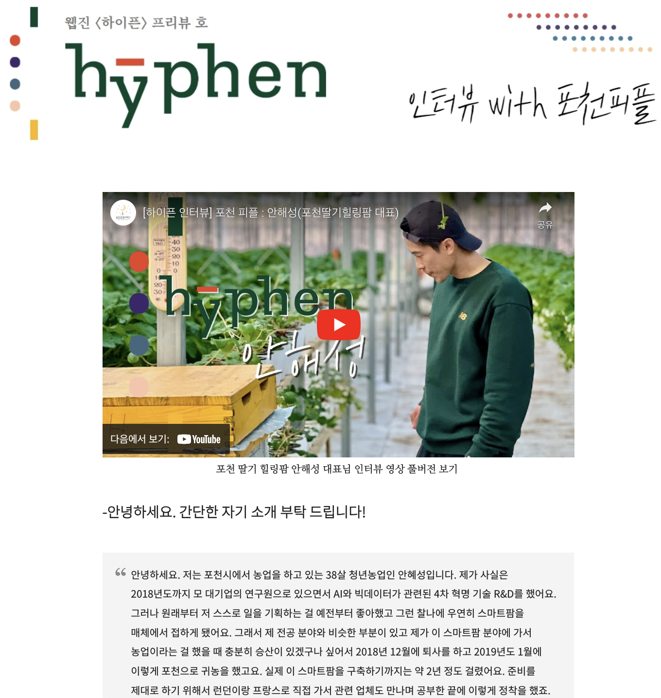 -포천문화재단 발행 온오프라인매거진 <하이픈> 프리뷰호 전담 진행 -웹진 온라인 플랫폼 개설 및 웹진 포스팅 콘텐츠 16개 제작 -인터뷰 영상 15개 제작 -오프라인용 웹진 기획 및 원고 작성, 편집디자인 등 제작 운영 총괄 포천문화재단 웹진 <하이픈> 바로가기 (클릭) 매거진 하이픈 포천문화재단이 운영하는 온오프라인 매거진 <하이픈>입니다. 오프라인 매거진은 상 하반기 발행됩니다. hyphen-pocheon.tistory.com 인터뷰 영상#1 인터뷰 영상#2 인터뷰 영상#3 웹진 <하이픈> 메인 페이지 포스팅 콘텐츠#1 포스팅 콘텐츠#2 포스팅 콘텐츠#3 공유하기 게시글 관리 주식회사 퓌트